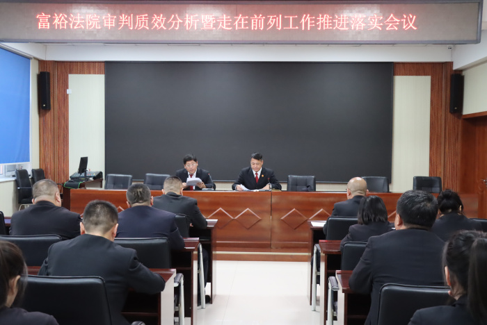 10月22日下午,富裕县人民法院召开审判质效分析暨“走在前列”工作推进落实会议,深入传达贯彻全市法院会议精神,全面复盘今年以来审判执行工作态势,精准聚焦“走在前列”目标要求,动员全院干警凝心聚力、全力冲刺年度各项目标任务,奋力开创法院工作新局面。党组书记、院长张文君主持会议并讲话,全体法官及各部门相关人员参会。