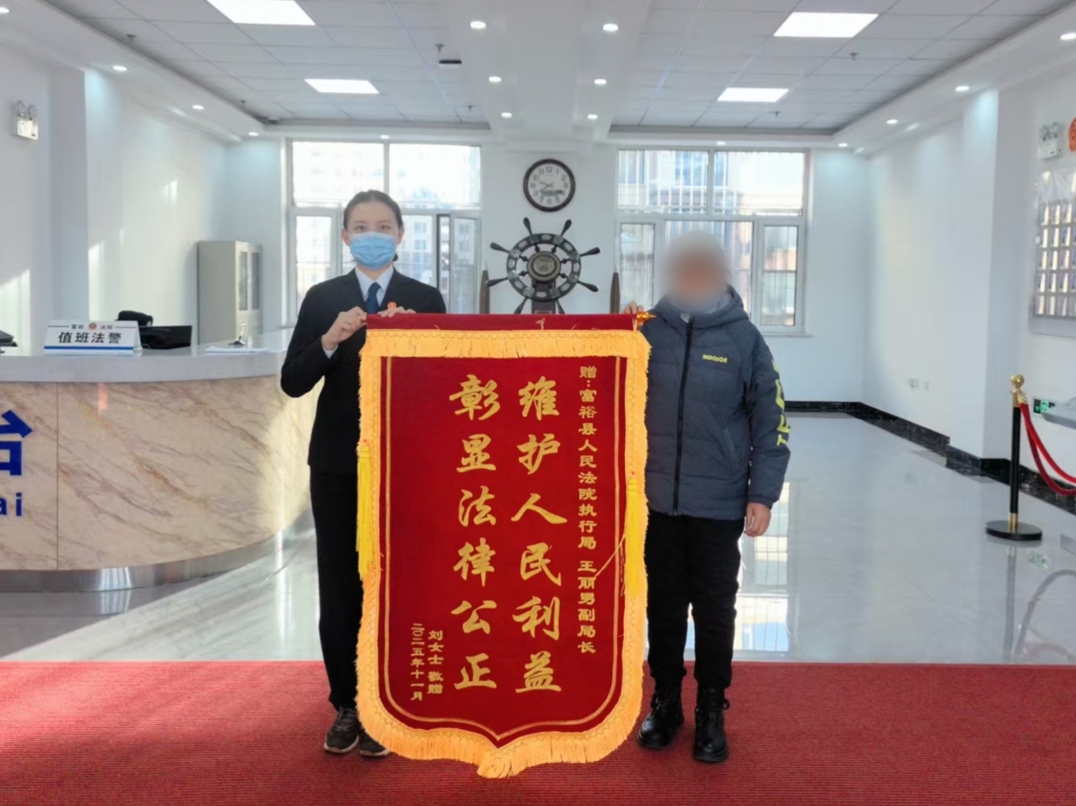 近日,富裕县人民法院执行局收到了一面“维护人民利益,彰显法律公正”的锦旗,表达了对执行法官王丽男及执行团队的工作认可与诚挚谢意。