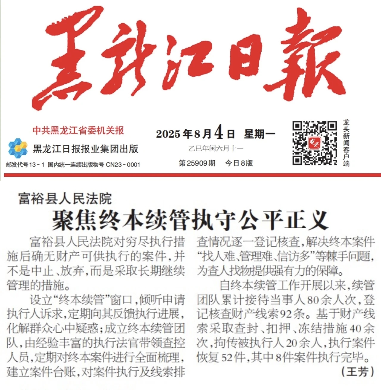 聚焦“沉睡终本”案件,设立终本续管窗口,定期向申请人反馈执行进展,设立终本续管窗口后,线索受理、核查、反馈平均时间明显缩短,当事人对案件了解、反映的更方便、更快捷,一批沉睡案、骨头案在续管机制推动下重新进入执行程序。自终本续管工作开展以来,续管团队累计接待当事人120余人次,登记核查财产线索153条,线索核查率达100%,采取查封扣押、冻结措施64余次,拘传被执行人30余人,提升执行效率,赢得人民群众的信赖和支持;同时创新信用修复机制,鼓励和引导被执行人纠正失信行为,自觉履行生效法律文书确定的义务,以多种举措提升人民群众获得感和满意度。