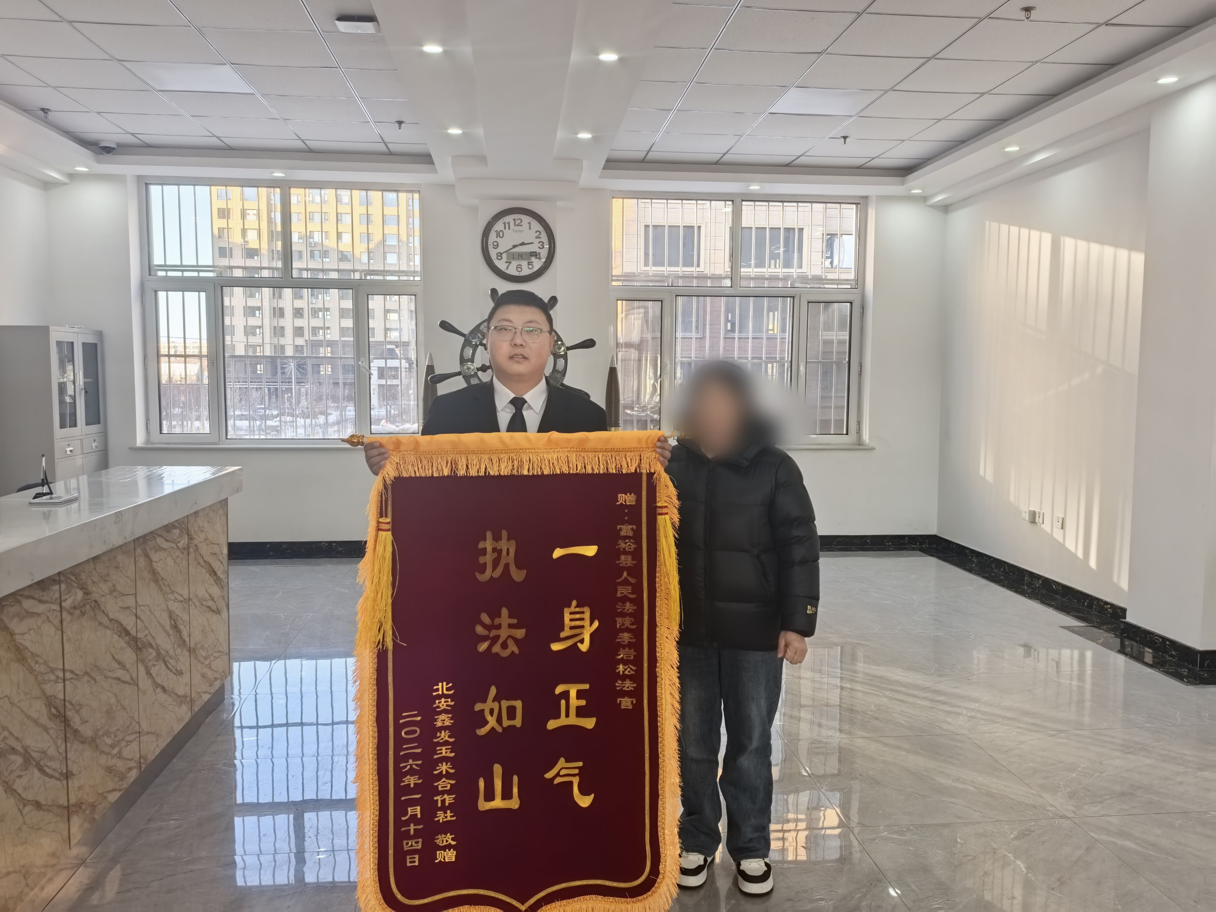 1月14日,当事人将一面印有“一身正气,执法如山”的锦旗送至富裕县人民法院执行局,对执行法官尽职尽责、全力攻坚,成功为其追回23万元玉米款表达诚挚谢意。
