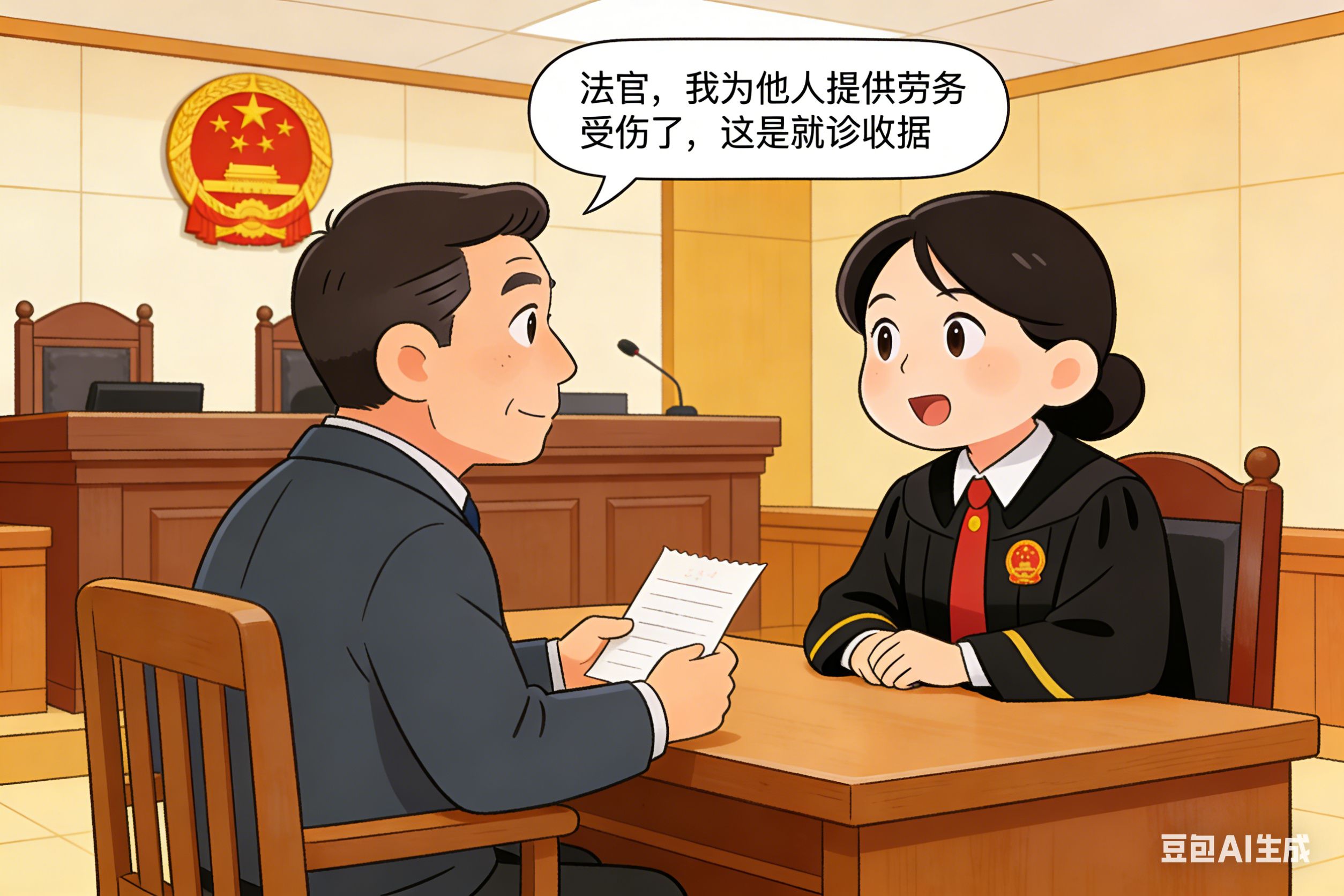 案件中,原告付某为被告周某提供劳务过程中不慎受伤,前往诊所治疗产生医疗费用,并要求给付误工费用。原告因文化水平有限,不会书写起诉状,未能准备完整的工资证明、正规医疗发票等材料,仅携带简易就诊收据来到塔哈法庭,希望通过诉讼维护自身合法权益。
